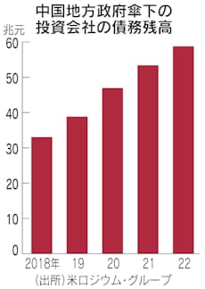 公式の地方債には一般債とインフラ建設などの資金を賄う専項債がある。財政省によると、22年末の発行残高は35兆元。融資平台の債務も合わせると100兆元近くになり、名目国内総生産(GDP)の8割近い計算になる。