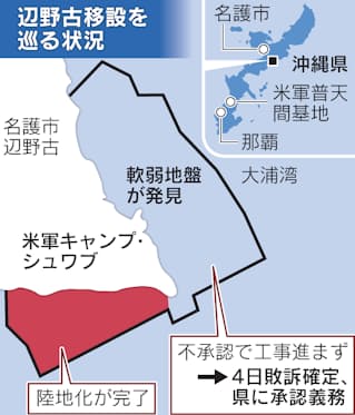 辺野古の埋め立て工事を巡っては、予定海域に軟弱地盤が見つかり、防衛省沖縄防衛局が2020年4月に県に設計変更を申請。県は調査不足などを理由に承認しなかった。同局からの審査請求を受け、国は県の不承認を取り消す裁決をし、設計変更の承認を求める是正指示も出した。