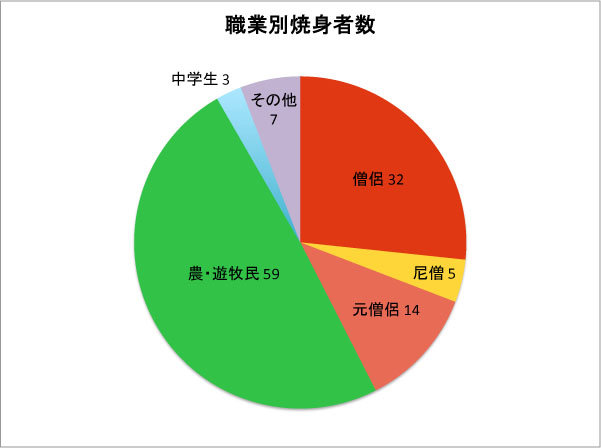 ・・・僧侶、尼僧、元僧侶を合わせると51人となり、農・遊牧民と共に、全体をほぼ2分している。この事からも、宗教弾圧政策と農・遊牧民政策が焼身の元凶と言えよう。