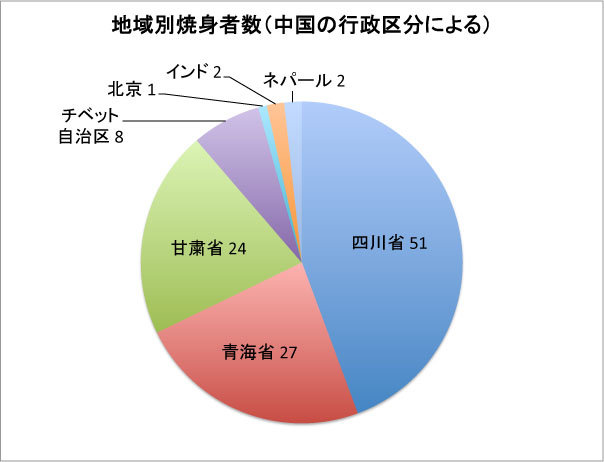 四川省チベット人居住区51人:ンガバ州ンガバ(阿坝州阿坝)県30人、ザムタン(壤塘)県4人、バルカム(马尔康)県3人、ゾゲ(若尔盖)県7人、カコク(红原)県1人;カンゼ州カンゼ(甘孜州甘孜)県1人、セルタ(色达)県1人、タウ(道孚)県2人、カンディン(康定)県2人。
