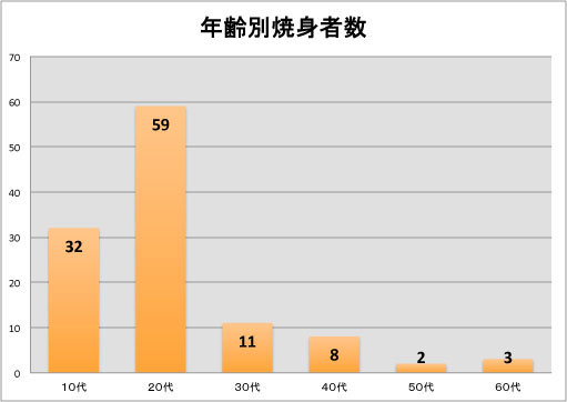 ・・・10代と20代を合われて91人、全体の79%に達する。圧倒的に若者の焼身者が多いことが分かる。