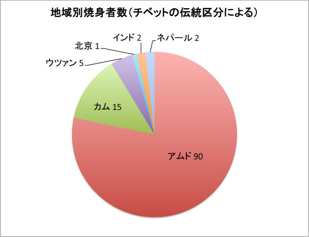 内地:ウツァンで5人、アムドで90人、カムで15人。(北京で1人。外地:インドで2人、ネパールで2人。)