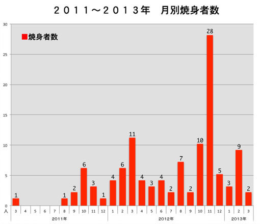 ・・・2013年についてはまだ何とも言えないが、2011年後半と2012年を見ると焼身発生件数には、明らかな波のようなものがあることが見て取れる。2011年は10月に向かって増え、その後一旦減少。2012年に入り、3月に向かって増え、また一旦減少した後、11月に向かって激増し、11月には28人もが焼身している。その後また減少した後、今年2月に9人、3月に今までのところ2人が焼身している。