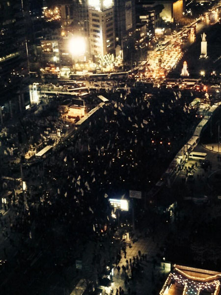 午後6時30分頃、激しい肉弾戦の末に警察の車壁を突破したデモ隊は、光化門広場に進出し始めた。1万ほどのデモ隊が光化門交差点を占拠して 「朴槿恵政権退陣」、「民営化中断」等のシュプレヒコールをあげ、その場を守った。